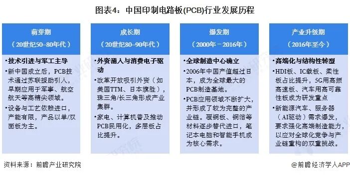 中国经济的快速增长和通信、计算机等下游行业的高速发展为印制电路板(PCB)的快速发展和渗透率的提升提供了有力支持。自起步至今,中国印制电路板行业从“跟跑”到“并跑”,逐步突破“卡脖子”环节,整体来看,其发展历程大致可分为四个阶段:萌芽、成长、爆发以及产业升级期。