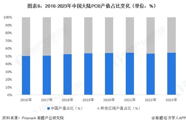 根据Prismark的数据,2016-2023年,中国大陆PCB产值占全球产值比重保持在50%左右波动,占比从2016年的50%波动上升至2023年的接近55%,已成为全球第一大PCB制造基地。