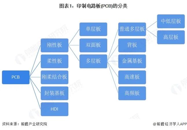 PCB产品种类丰富,按照基材的柔软性可以分为刚性板(R-PCB)、柔性板(FPC)、刚柔结合板;按照导电图的层数分,可分为单面板、双面板、多层板;另外,还有特殊产品分类,如高速高频板、高密度连接板(HDI)、封装基板等。