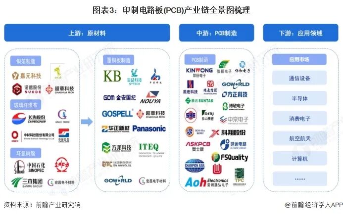 从产业链各环节代表性企业来看,上游原材料环节主要有诺德股份(维权)、嘉元科技等铜箔供应商,中国巨石、长海股份等玻璃纤维布企业,中国石化、三木集团、东材科技等环氧树脂企业,以及建滔积层板、生益科技、南亚新材等覆铜板企业。产业链中游主要有鹏鼎控股、东山精密、深南电路、沪电股份、景旺电子等PCB制造商。下游应用广泛,包括通讯领域、计算机、汽车电子、消费电子等。