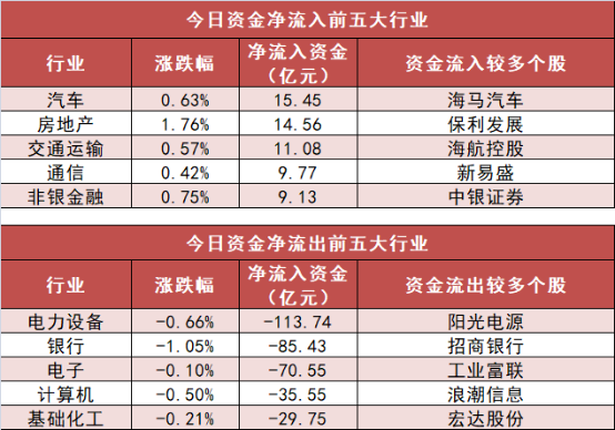 申万一级行业中,9个行业实现资金净流入,其中汽车行业净流入15.45亿元居首。