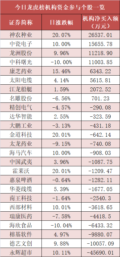 盘后龙虎榜数据显示,机构现身多股,其中神农种业等股票呈现机构资金净买入,永辉超市等股票呈现机构资金净卖出。