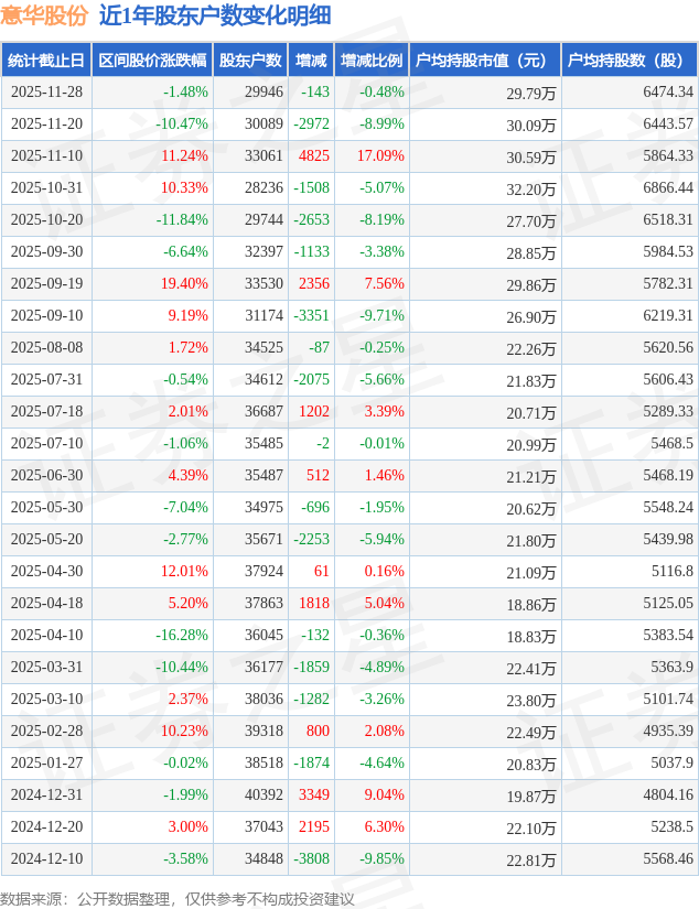 从股价来看,2025年11月20日至2025年11月28日,意华股份区间跌幅为1.48%,在此期间股东户数减少143.0户,减幅为0.48%。