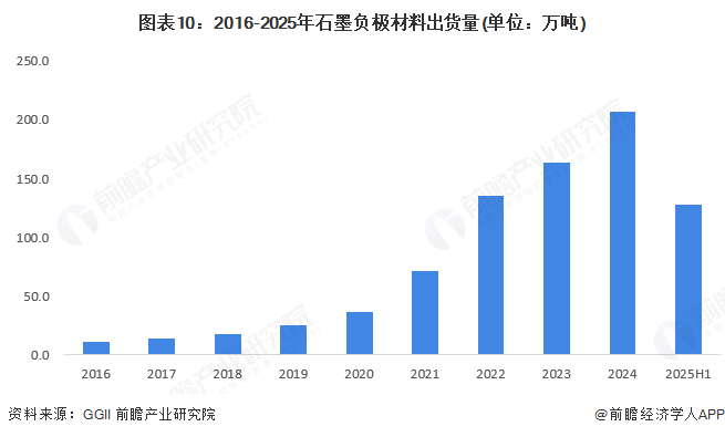 2016-2024年,中国石墨负极材料出货量呈现上升趋势,2024年超过200万吨,增速为26%。2025年上半年,中国石墨出货量已经达到127.6万吨,同比增长35.8%。