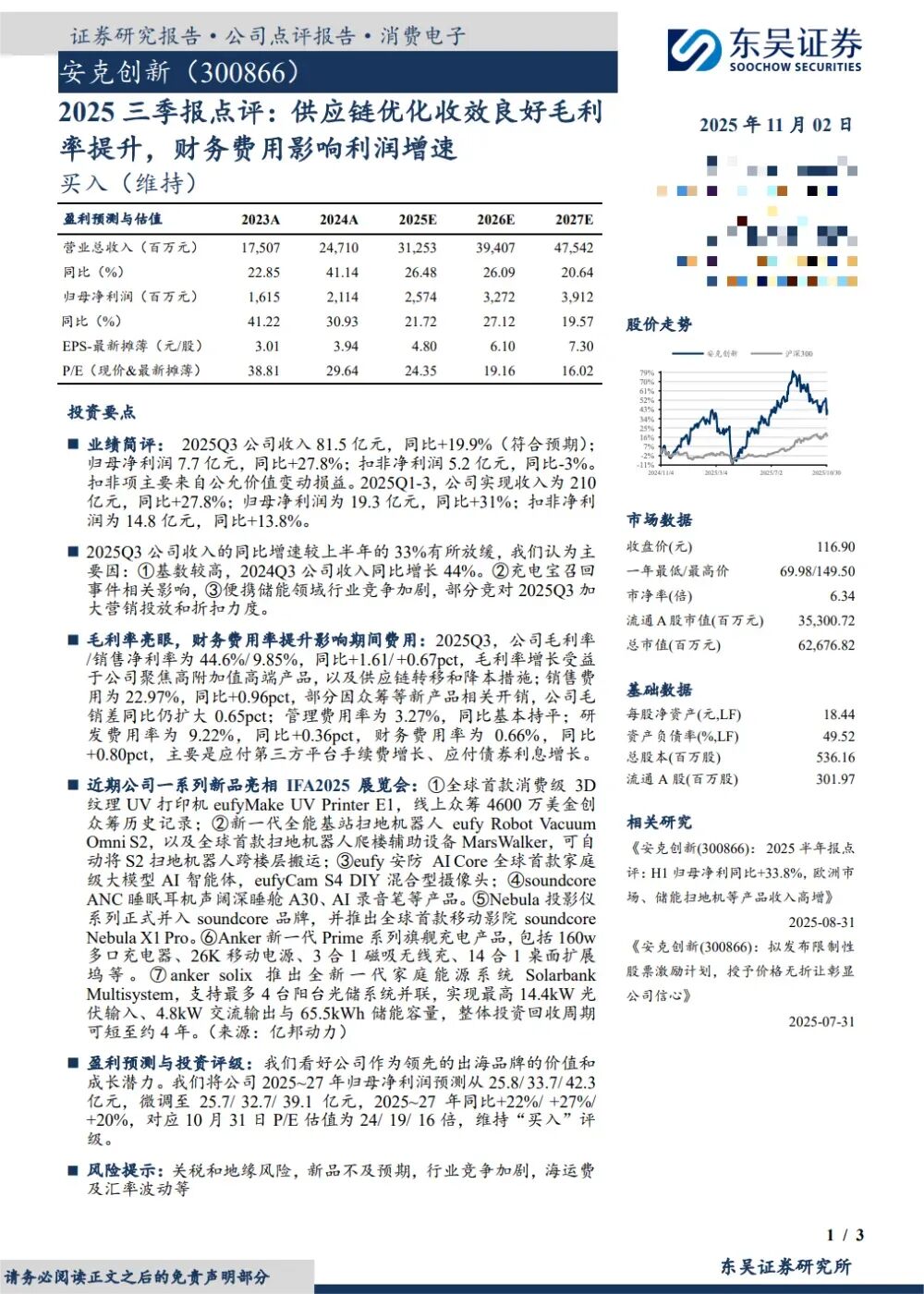 第三季度,公司持续加大研发和品牌投入以提升长期竞争力,研发与销售费用同比分别增长24.72%和25.13%,导致扣非净利润略有下滑。期内,充电储能、智能创新及智能影音三大核心品类发布多款新品,并在国际展会亮相。