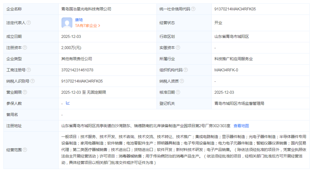 青岛国冶星注册于青岛市城阳区,注册资本2000万元,经营范围覆盖集成电路制造、显示器件制造、光电子器件制造、半导体器件专用设备制造以及电池零配件生产等多个高科技制造领域。
