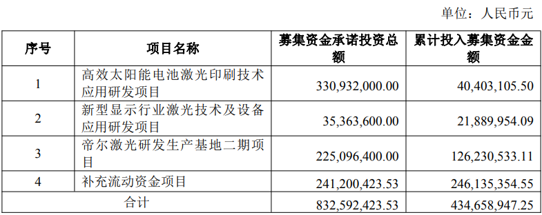 2021年8月,帝尔激光成功发行8.4亿元可转换公司债券,扣除费用后净募集资金约8.33亿元。这笔资金被规划用于四个主要项目,其中包括被终止的“高效太阳能电池激光印刷技术应用研发项目”。