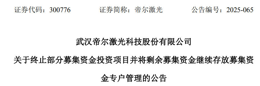 2025年12月10日,帝尔激光召开董事会,审议通过终止“高效太阳能电池激光印刷技术应用研发项目”。根据公告,这一项目原计划投资约3.31亿元,截至2025年12月8日仅投入约4040.31万元,剩余募集资金高达约3.28亿元。这个曾经被寄予厚望的项目,如今却因“市场需求环境发生变化”而终止。