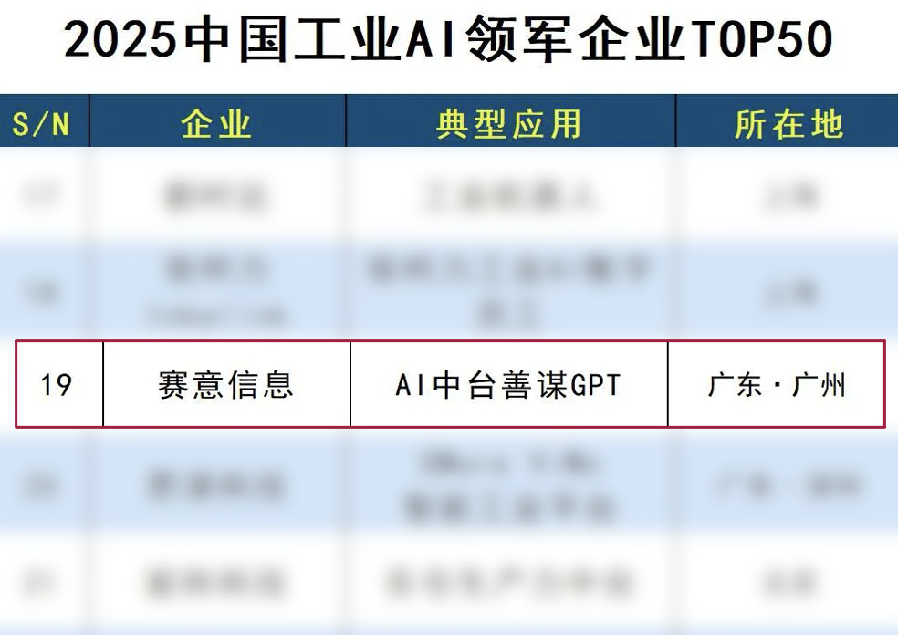 近日,国内权威咨询机构DBC德本咨询正式发布“2025中国工业AI领军企业TOP50”榜单。凭借在工业人工智能领域的前沿探索与扎实落地,赛意信息成功入选,其自主研发的善谋GPT平台成为赛意信息获选的重要技术支撑。