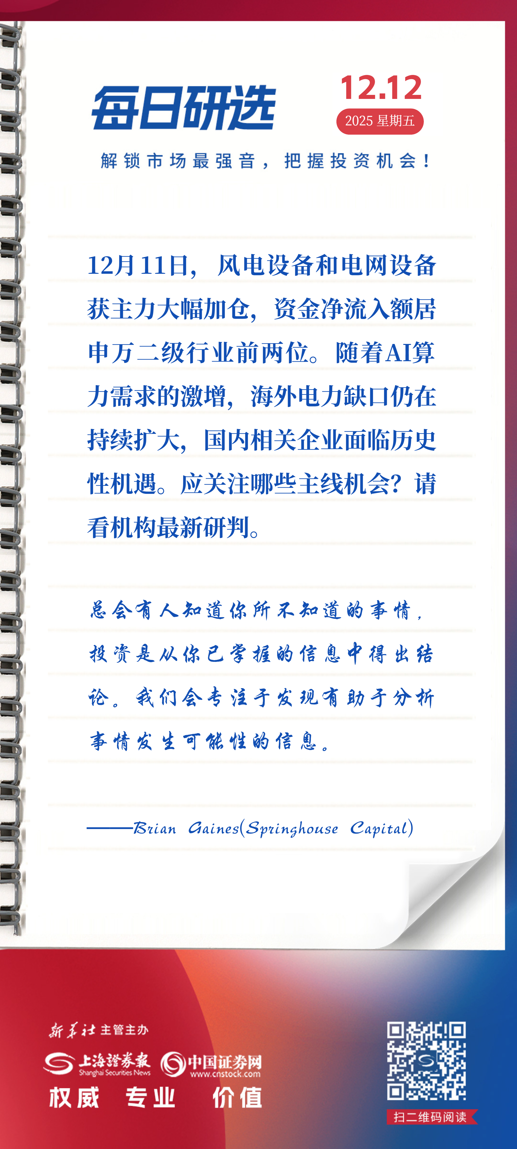 12月11日,风电设备和电网设备获主力大幅加仓,资金净流入额居申万二级行业前两位。随着AI算力需求的激增,海外电力缺口仍在持续扩大,国内相关企业面临历史性机遇。应关注哪些主线机会?请看机构最新研判。