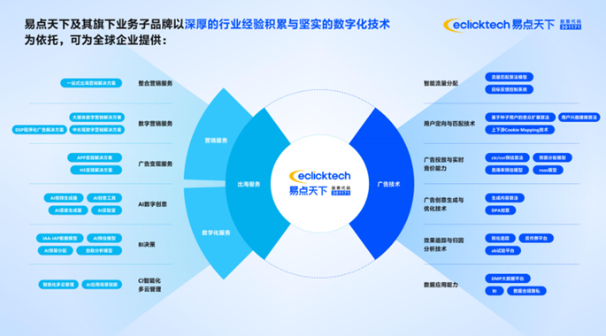 易点天下,作为一家率先在出海营销领域布局AIGC战略的营销科技公司,秉持“科技使世界变得更平”的使命,致力于 以“出海服务”为核心,为企业提供出海整合营销、数字营销、广告变现在内的营销服务,以及AI数字创意、BI决策、 CI 智能化多云管理等出海数字化服务。