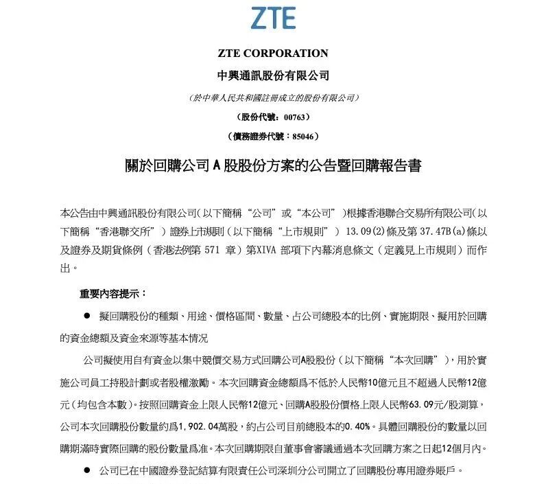 今日(12月12日)午间,中兴通讯在港交所发布公告称,公司拟使用自有资金以集中竞价交易方式回购公司A股股份,用于实施公司员工持股计划或者股权激励。本次回购资金总额为不低于人民币10亿元且不超过人民币12亿元(均包含本数)。按照回购资金上限人民币12亿元、回购A股股份价格上限人民币63.09元/股测算,公司本次回购股份数量约为1902.04万股,约占公司目前总股本的0.40%。