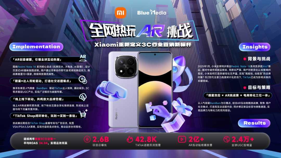 2025年,聚焦Redmi Note 14 系列全球上市,我们联合TikTok借势内容场着眼差异化突围与海外市场品牌影响力持续守擂。在海外市场新品频发、同质化卷配置、用户缺乏差异化感知的环境下,我们借势TikTok游戏化创意互动的流行趋势,发起#AllStarTeam AR“赛博跑酷”挑战,以AR趣味跑酷为切口,联合TikTok顶级达人,上线10+国家互动挑战赛,游戏玩法沉浸式植入产品卖点,强势占领用户心智, 让用户“一玩即知” ,用沉浸式互动让新品核心卖点直观可感。多内容、多触点、多端联动助力品牌传播Max,项目总曝光26亿,活动期间品牌关键词TikTok端内搜索量4.28万,新品相关搜索对比上代同期提升67.1%,贡献了46%的GMV,转化效率最高可达认知阶段用户的12倍。