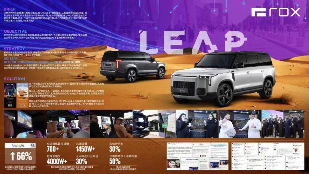 当中国汽车品牌首次进入沙特市场:在基本没有本地品牌认知、没有本地粉丝、没有历史声量积累情况下,面对已有声量优势的强劲对手,营销资源有限,首战必须精准出击。我们需要通过一次大型活动,完成新市场从0到1的启动,明确沙特市场的品牌定位、快速建立社媒内容池和搜索资产,并为经销商开业提供热度支持和意向客户导流。我们借势中东最大科技展,强势打入沙特核心市场。通过造势、造梗、造沉淀的三步走社媒策略,打造“在地感”,让极石品牌被参与、被讨论、被记住。改变以往的“卖车”模式,而是讲人、讲体验、讲情绪,让用户自愿“种草”。极石品牌关键词在16天内搜索指数上涨60%+,内容影响力上破圈4,000万曝光,用户主动转发和参与。社媒导流经销商,私信转化率超30%,反哺经销商开业热度,为其后续独立运营提供基础流量池,一战成名带动全球关注。