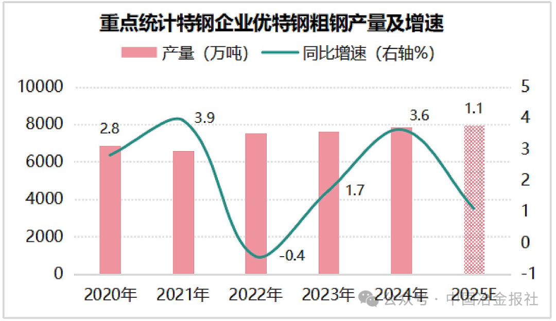 2024年中国特钢企业协会(下称特钢协)重点统计会员企业优特钢粗钢产量为7869万吨,较2021年增长19.3%,较“十三五”末增长14.5%。预计2025年(图示为2025E,下同)优特钢粗钢产量为7974万吨,较2021年增长20.9%,较“十三五”末增长16.0%。