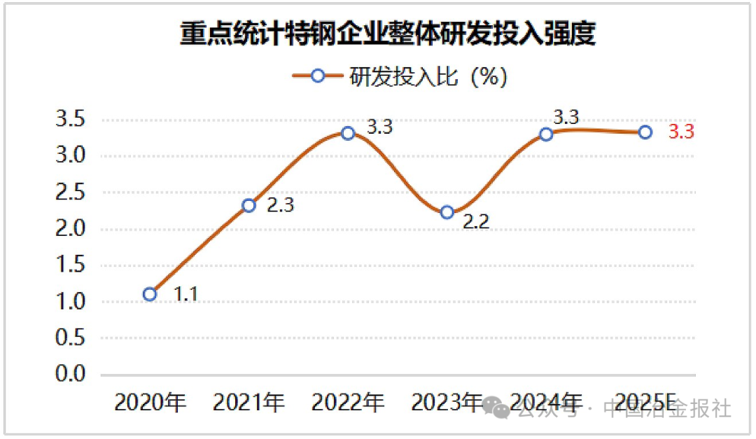 2024年特钢协重点统计会员企业研发投入强度为3.3%,较2021年提高1个百分点,较“十三五”末提高2.2个百分点。预计2025年研发投入强度维持2024年水平。