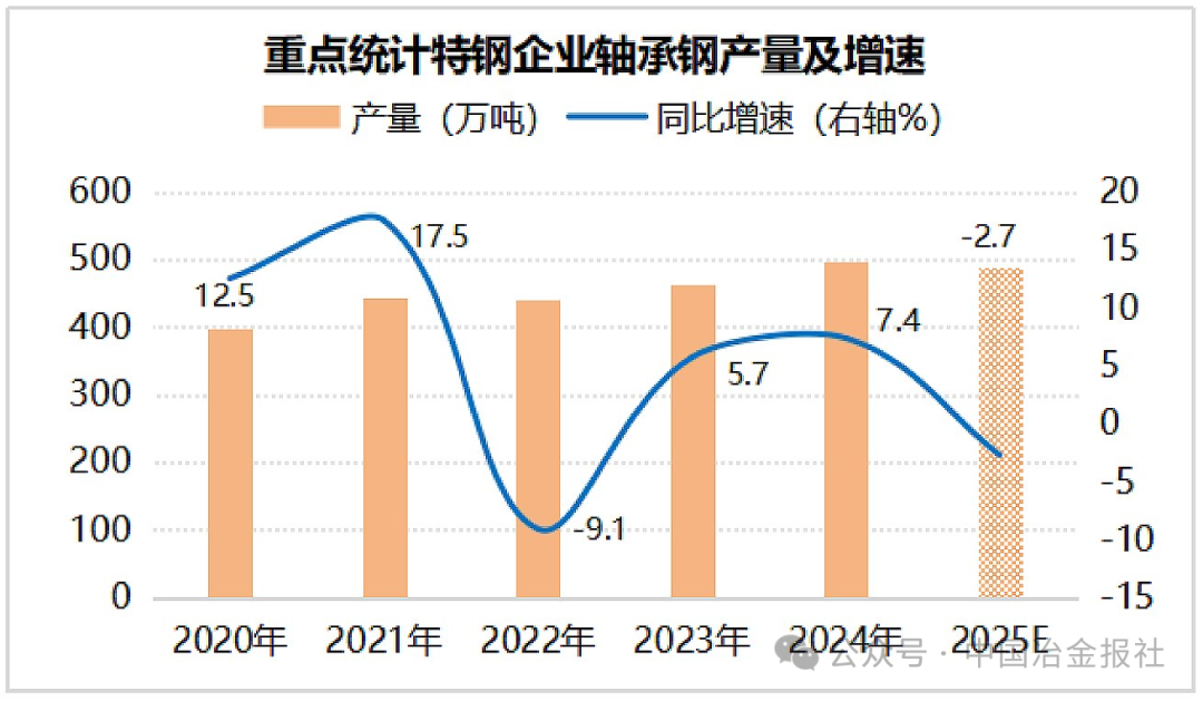 2024年特钢协重点统计会员企业轴承钢粗钢产量为497万吨,较2021年增长12.2%,较“十三五”末增长25.2%。预计2025年轴承钢粗钢产量为488万吨,较2021年增长10.2%,较“十三五”末增长22.9%。