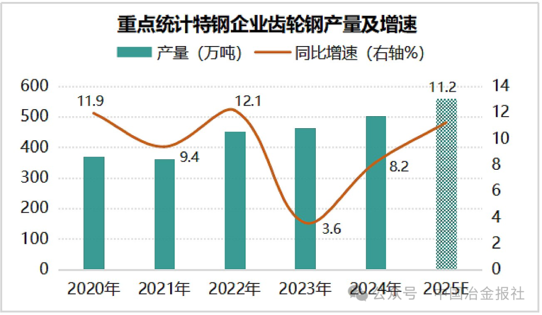 2024年特钢协重点统计会员企业齿轮钢粗钢产量为502万吨,较2021年增长39.1%,较“十三五”末增长35.7%。预计2025年齿轮钢粗钢产量为560万吨,较2021年增长55.1%,较“十三五”末增长51.4%。