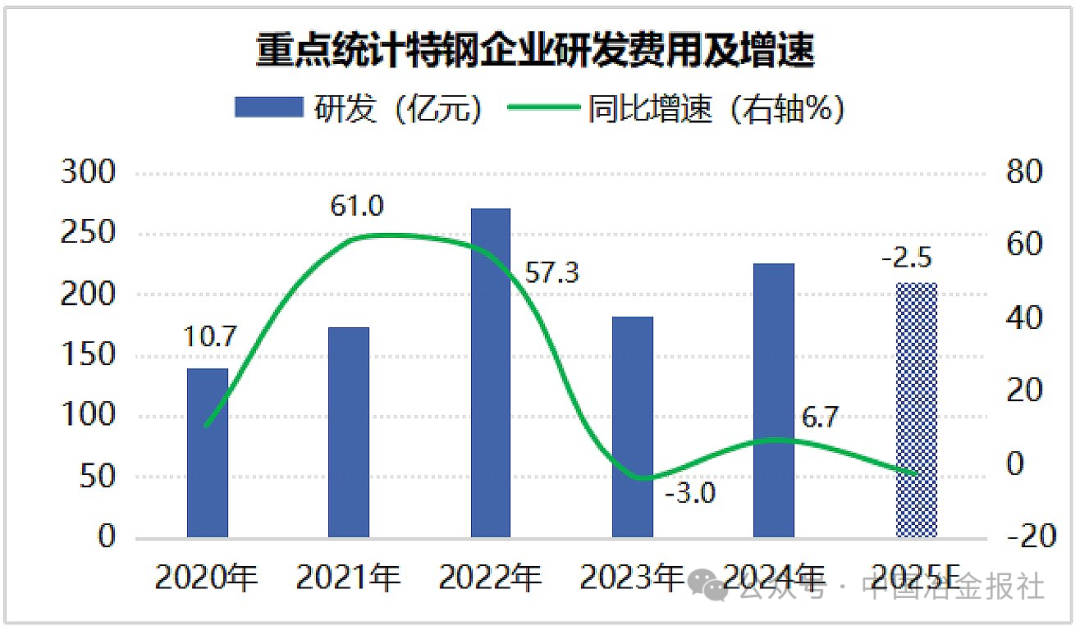 2024年特钢协重点统计会员企业研发费用为226亿元,较2021年增长29.9%,较“十三五”末增长61.4%。预计2025年研发费用为211亿元,较2021年增长21.3%,较“十三五”末增长50.7%。