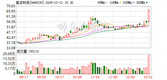 12月12日尾盘科创板股航宇科技涨停,截至14:46,股价报67.28元,成交9.68亿元,换手率8.35%,振幅20.42%。