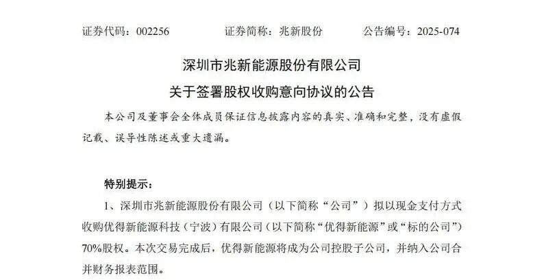 2025年12月11日晚间,兆新股份(002256)抛出重磅公告,拟以现金支付方式收购优得新能源科技(宁波)有限公司70%股权,交易对价上限2.2亿元。优得新能源将正式成为其控股子公司并纳入合并财务报表。