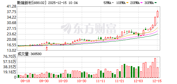 斯瑞新材股价再创历史新高,该股近期呈不断突破新高之势,近一个月累计有11个交易日股价刷新历史纪录。截至09:32,该股目前上涨3.34%,股价报35.60元,成交807.25万股,成交金额2.86亿元,换手率1.10%,该股最新A股总市值达275.38亿元,该股A股流通市值260.53亿元。