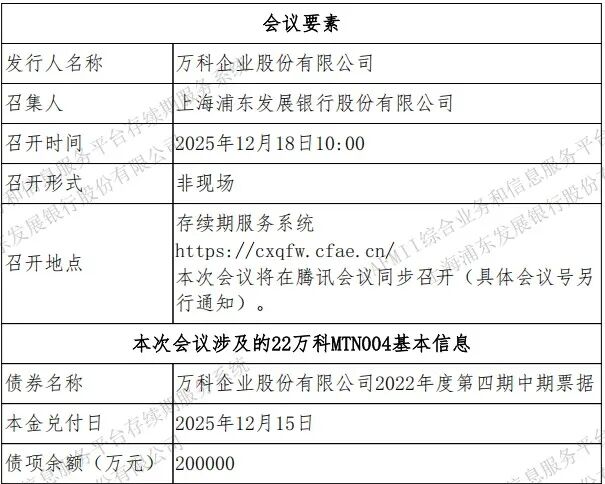 久期财经讯,12月15日,会议召集人浦发银行发布关于召开“22万科MTN004”2025年第二次持有人会议的公告。