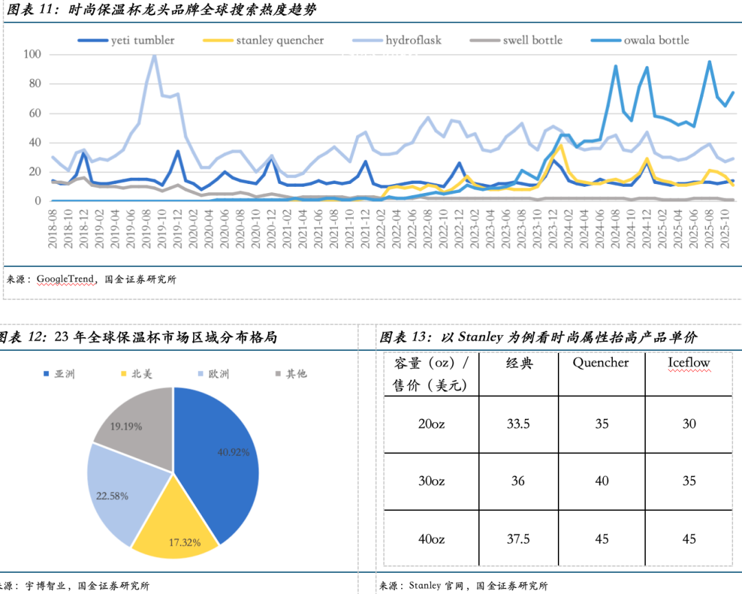 北美作为时尚保温杯发源地,多品牌共同发力加速市场渗透。分地区看,全球保温器皿市场的主要消费需求仍集中在美国、欧盟、日本和加拿大等经济发达国家。北美市场2019年起率先推动保温杯转型,主流品牌合力推进市场教育,将保温杯打造为兼具审美属性和社会身份标识的时尚单品。具体来看,2019年S'well开启保温杯时尚审美需求,21年Hydro Flask开启社交媒体与KOL营销合作打造潮流现象模式,此后Yeti通过Instagram、YouTube等新媒体将品牌塑造为热爱生活身份标识,并上线DIY定制强化品牌情感联结与社交属性,将保温杯使用场景从户外扩充到多元生活方式。此后Stanley定位精致时尚、Owala定位Z世代活力路线,多品牌交替流行,驱动市场渗透与行业扩张。