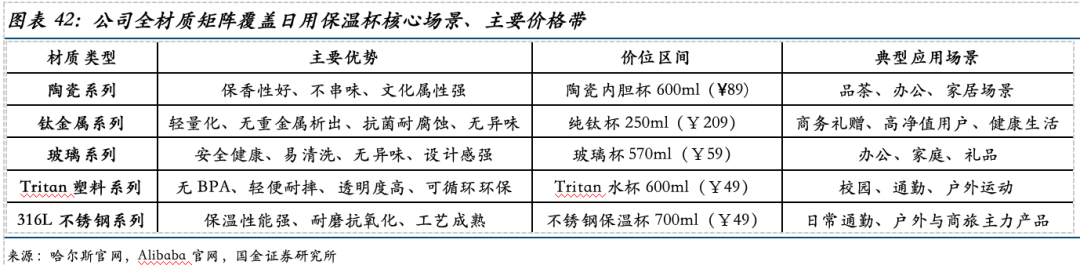 伴随健康生活理念与消费升级趋势的加速,公司在传统不锈钢制品的基础上,构建多元材料矩阵,覆盖日用杯型核心场所与各档位价格带。金属系列产品公司创新性推出钛杯,原先应用于航空航天等高端领域的钛材质拥有超轻、耐腐蚀、无重金属析出及抗菌防异味等特性,满足消费者对于高品质、健康饮水器具的需求。目前钛杯仍处于市场培育早起阶段,公司新材质产品市场渗透也与其渠道变革措施相适应,通过与沃尔玛等B端渠道,加速新材质的市场渗透与普及。