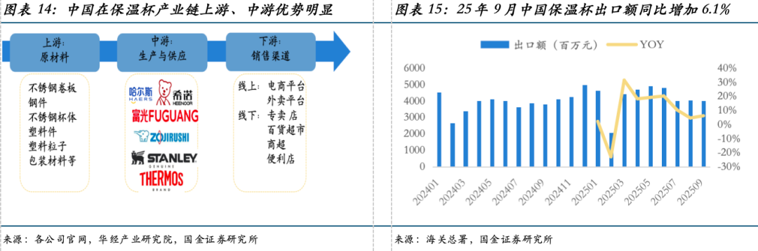 保温杯行业产业链主要包括上游原材料供应商、中游制造商和下游销售渠道。上游原材料方面,中国不锈钢、塑料件等原材料资源丰富,为高质量生产奠定基础。中游制造方面,保温杯真空保温、不锈钢弯曲度及韧性等技术要点对于产品质量和使用感受影响颇深。中国凭借改革开放以来承接保温杯生产的深厚积淀,已形成产业集群,制造水平全球领先。目前中国已成为全球不锈钢保温器皿主要生产大国和出口大国,25年Q1/Q2/Q3中国保温杯出口金额达到111亿元/144亿元/121亿元,同比+5.1%/+19.1%/+6.9%。