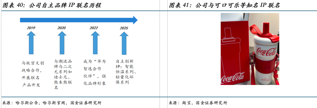 多年自主品牌投入进入收获期,多渠道发力哈尔斯品牌建设。渠道方面,传统渠道汰换,上探经销网络、KA与礼品渠道利润空间,同时积极开拓即时零售、会员商超等新兴渠道,并强化线上高毛利率渠道运营。产品层面,公司以IP联名、情绪价值与功能创新驱动品牌年轻化与溢价提升,同时针对高端群健康需求打造不同材质壶杯,并与华为鸿蒙合作打造健康科技饮水产品。