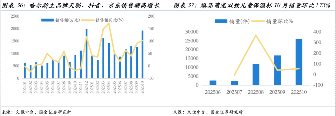 公司线上已覆盖天猫、淘宝、抖音、小红书等全网络运营。25年10月哈尔斯品牌天猫、抖音、京东三平台销量合计24万件,同比+105%;销售额约1930万元,同比+102%,自24年12月以来一直保持双位数高增长。公司打造多个爆款产品,其中25年10月两大爆品分别为萌宠双饮弹跳儿童保温杯/Fufu小奶罐,10月天猫、抖音、京东合计销量分别为2.6/1.1万件,环比+55%/-4%,销售额为2.0/0.8百万元,环比+73%/-10%,整体仍保持较高增长态势。目前线上自主品牌为高毛利率板块,为营收和盈利能力保驾护航。