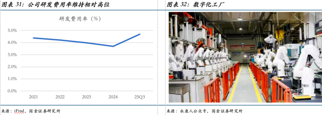 公司积极推进智能化转型,国内生产基地2021年起实施数字化工厂,以MES、ERP、APS等系统为基础实现生产环节的数据整合与设备互联,对标灯塔工厂标准,建立自动化注塑、五金、焊接、抛光等全工序自动化产线。人均生产效率提升超20%,产品研发周期缩短约30%,万元产值成本降低超10%。已向灯塔工厂迈进。依托已跑通数字化精益体系,持续优化全球供应链效率,有望为东南亚输出中国方案。