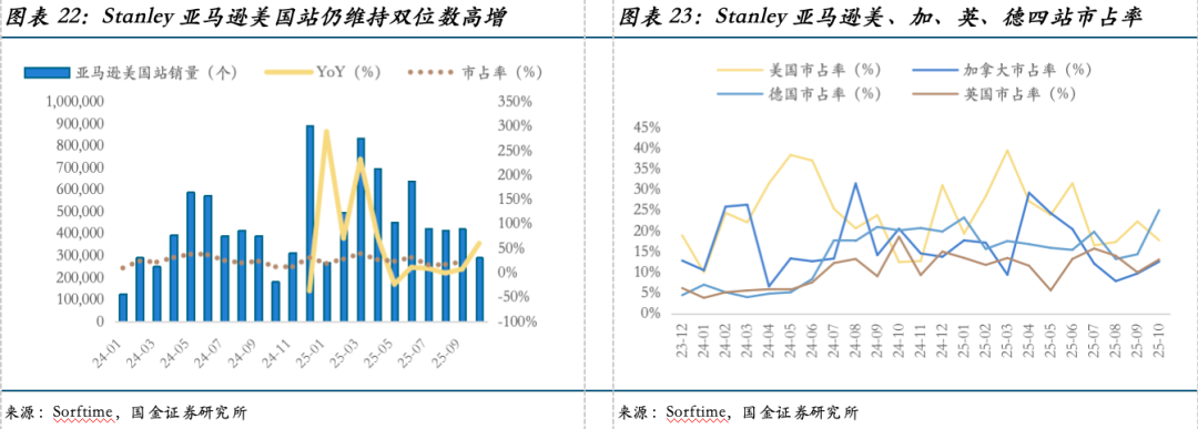 根据Sorftime数据,SIGG亚马逊美、英、德、法、西、意六站2025H1/2025Q3销售额为6179/4514万元,同比38%/33%,整体呈现高增长趋势。展望未来,SIGG公司资源赋能下持续扩容产品矩阵,逐步突破对德语区的依赖,欧洲英语区有望成为下一阶段突破方向。