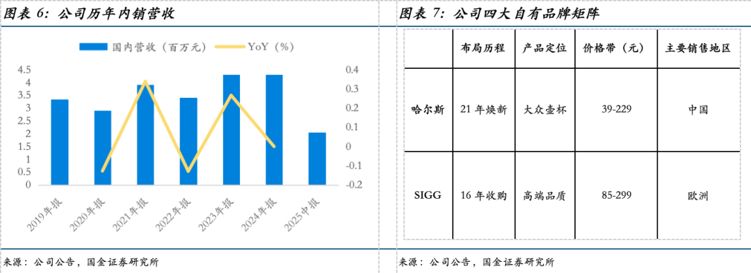 自主品牌建设初见成效,打开第二增长曲线。25H1公司品牌中心完成“组织重构+能力跃升”双重升级,独立配备研、产、销全链路战队,锁定高潜力细分赛道,构建自主品牌爆款矩阵,已涵盖哈尔斯、SIGG等自主品牌。其中哈尔斯品牌2022年顺应快消化行业趋势全新升级,有效布局国内大众市场。百年瑞士品牌SIGG于2016年为公司全资收购,借助原品牌影响力与哈尔斯资源赋能,深耕欧洲壶杯市场。