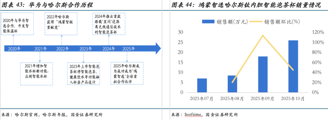 渠道层面,部分合作款已进驻华为线下门店,借力华为庞大用户资产实现品牌曝光与盲区客群触达。品牌宣传层面,华为智选为哈尔斯强势背书;2025年华为智选品牌焕新鸿蒙智家后,公司成为全球首批合作伙伴,产品革新叠加生态赋能,增量空间有望持续打开。