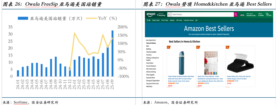 2024年以来,FreeSip系列水瓶已多次登顶亚马逊Home & Kitchen销量榜首,25年Q1-Q3亚马逊美国站销量分别为39.9/39.6/85.3万只,同比+110%/+39%/157%,增势迅猛,站稳时尚保温杯第一梯队。复盘Yeti、Stanley的路径,新品牌在起量后往往仍可维持约3-5年的高增长。预计Owala将持续受益于功能创新与年轻化双飞轮,并逐步拓展渠道与海外市场,有望延续高增。