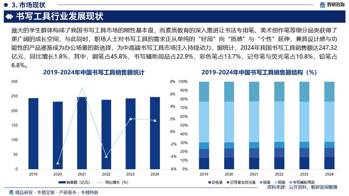 销售额:庞大的学生群体构成了我国书写工具市场的刚性基本盘,而素质教育的深入推进让书法专用笔、美术创作笔等细分品类获得了更广阔的成长空间,与此同时,职场人士对书写工具的需求正从单纯的“好用”向“质感”与“个性”延伸,兼具设计感与功能性的产品逐渐成为办公场景的新选择,为中高端书写工具市场注入持续动力,据统计,2024年我国书写工具销售额达247.32亿元,同比增长1.8%。