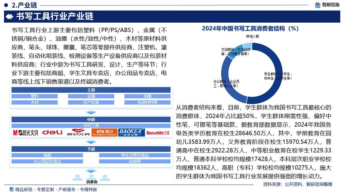 产业链核心节点:书写工具行业上游主要包括塑料(PP/PS/ABS)、金属(不锈钢/铜合金)、油墨(水性/油性/中性)、木材等原材料供应商,笔头、球珠、墨囊、笔芯等零部件供应商,注塑机、灌装线、自动化组装线、检测设备等生产设备供应商以及包装材料供应商;行业中游为书写工具研发、设计、生产等环节;行业下游主要包括商超、学生文具专卖店、办公用品专卖店、电商等线上线下销售渠道以及终端消费者,书写工具终端消费者主要包括学生群体、办公群体、文创群体和老年群体。