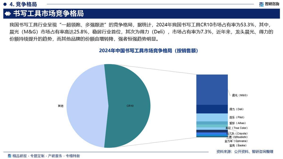 市场竞争格局:我国书写工具行业呈现“一超领跑、多强跟进”的竞争格局,据统计,2024年我国书写工具CR10市场占有率为53.3%,其中,晨光(M&G)市场占有率高达25.8%,稳居行业首位,其次为得力(Deli),市场占有率为7.3%,近年来,龙头晨光、得力的份额持续提升的趋势,而其他品牌的份额由增转降,强者恒强趋势明显。