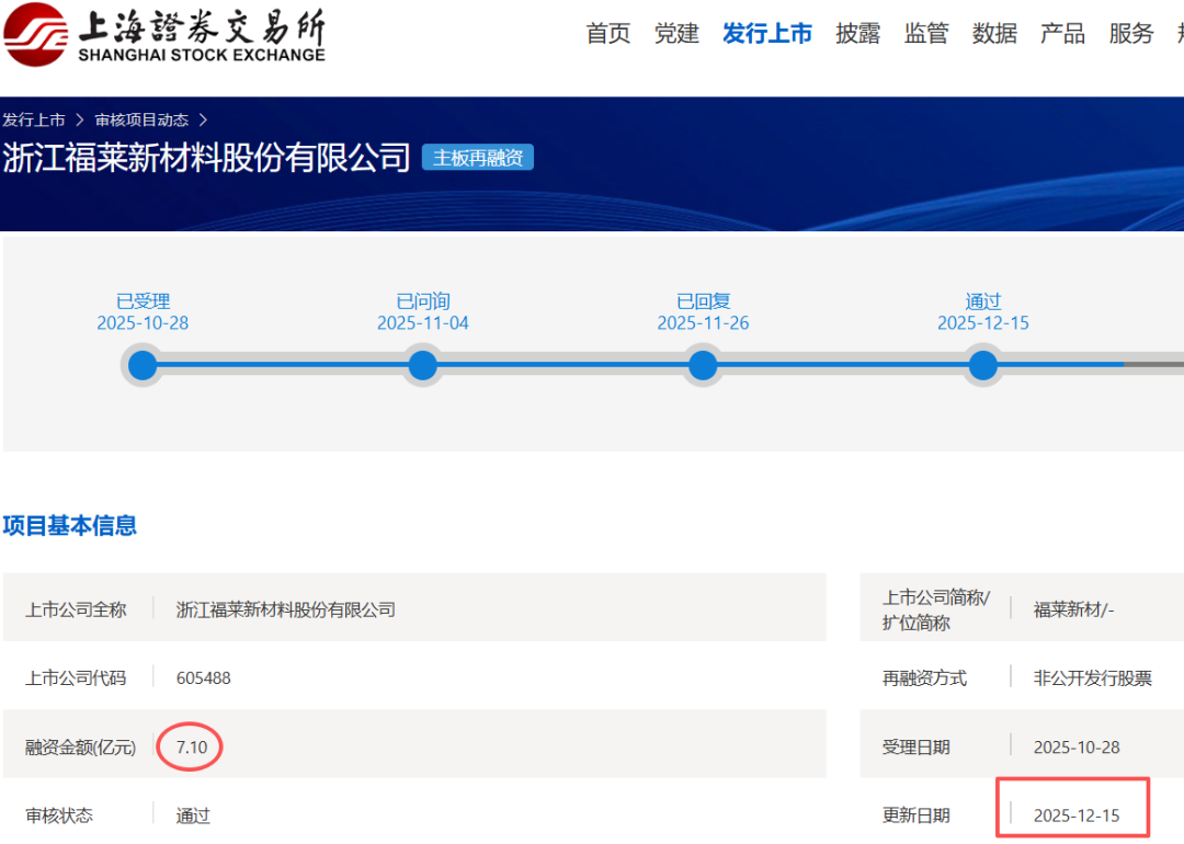 12月15日,浙江福莱新材料股份有限公司(证券代码:605488,简称:福莱新材)向特定对象发行股票申请,获上海证券交易所审核通过。此次拟募集资金总额不超过人民币7.1亿元,主要用于标签标识印刷材料扩产、电子级功能材料扩产升级及研发中心升级等项目。