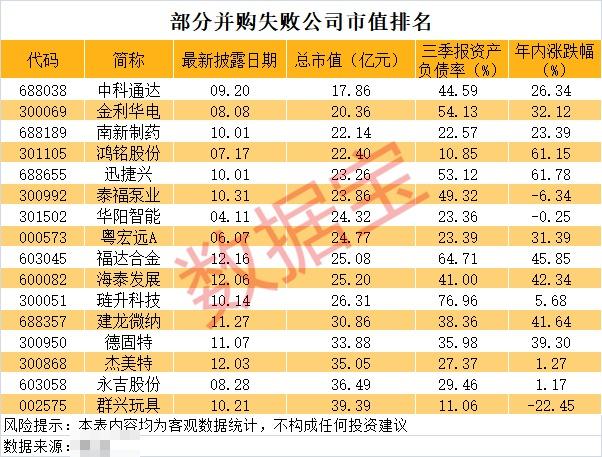 据证券时报·数据宝统计,年内首次披露并购案的公司中,有38家作为并购方的公司宣告终止并购。其中,福达合金、芯原股份、海光信息、思瑞浦、海泰发展、杰美特等公司12月宣布并购失败。