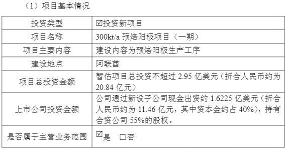 该项目暂估总投资不超过2.95亿美元(折合人民币约20.84亿元),索通发展将持有合资公司55%的股份,主导项目运营。