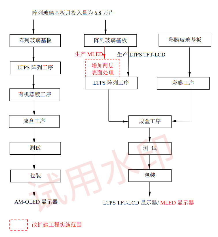 从工艺流程看,本项目实施后,全厂产品种类为LTPS TFT-LCD、AM-OLED及MLED中小尺寸显示器。其中,MLED沿用LTPS TFT-LCD生产线,在LTPS TFT-LCD阵列工序增加两层表面处理工艺,其他生产工艺均沿用现有。