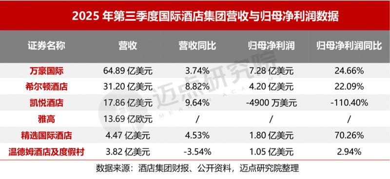 2025年第三季度,国际酒店集团营收整体呈2%-8%的同比增长态势,全球酒店行业温和修复。但净利润受区域市场表现、成本控制能力差异影响,分化格局进一步凸显。万豪国际集团、希尔顿集团凭借规模优势与轻资产模式实现盈利高增,精选国际酒店集团等酒店集团也迎来利润爆发;而凯悦酒店集团则陷入亏损,与盈利企业形成鲜明反差,行业“两极分化”格局在本季度更为凸显。