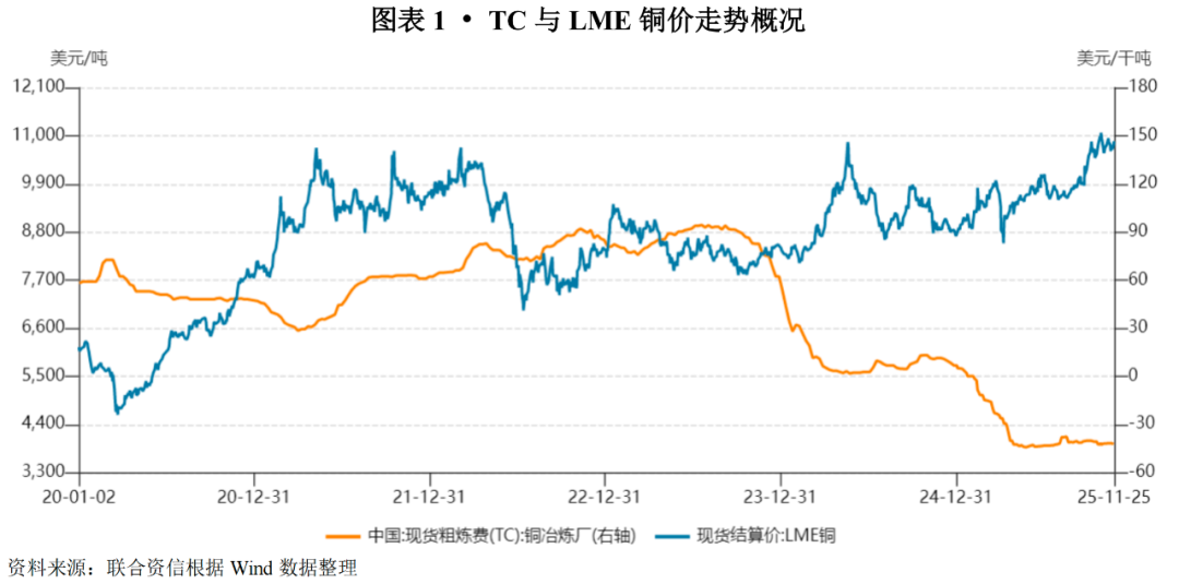 对于国内铜冶炼产能,进口铜精矿定价逻辑为:(LME现货均价-铜精矿加工费TC/RC)×汇率,再叠加冶炼成本,即为国内炼厂生产成本。加工费(TC/RC)作为衡量铜产业链上的利益分配、供需平衡以及趋势导向的关键指标,直接反映出矿山与冶炼厂之间的博弈关系。自2023年三季度末以来,全球铜精矿市场经历了结构性转变,TC/RC进入下行通道并持续探底;该趋势在2025年进一步加剧,中国进口铜精矿现货TC首次出现负值,而后持续在-40美元/干吨的深度负值区间徘徊,创下历史新低。