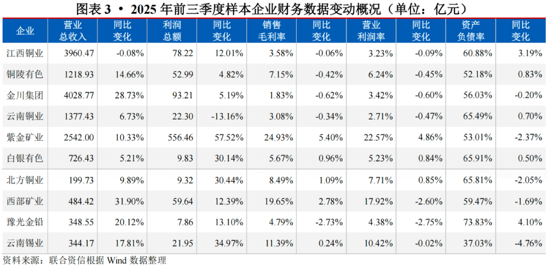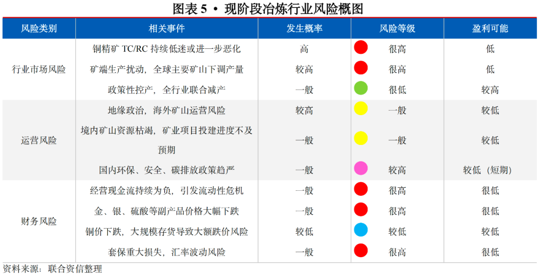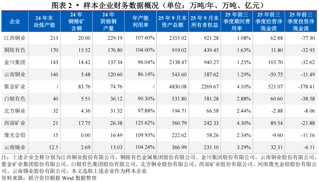 产能利用率方面,现阶段激烈的“内卷式”竞争不仅削弱了我国冶炼企业在原材料采购中的议价能力,同时严重挤压企业生存空间,《铜产业高质量发展实施方案(2025—2027年)》的出台,要求新建矿铜冶炼项目原则上需配套相应比例的权益铜精矿产能,等同于严控铜冶炼新增产能;CSPT小组也多次呼吁中国铜冶炼厂联合减产;另外,中国有色金属工业协会表示铜冶炼行业“内卷式”竞争对行业影响大,损害了国家和行业利益,同时于近期建议,参照电解铝行业“产能天花板”经验,对铜、铅、锌等重点金属的冶炼产能设定上限,以防止“无序扩张”和“价格战”进一步吞噬行业利润。如果控产能和联合减产的“反内卷”得以实现,将明显提升冶炼企业议价话语权,有助于促进铜精矿加工费(TC/RC)回归合理水平,改善冶炼企业盈利现状与现金流水平,降低企业信用风险。