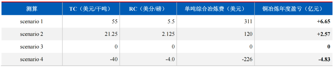 “负加工费”意味着冶炼企业不仅无法赚取加工收益,反而需要向矿山支付费用以获得铜精矿的加工权,这直接颠覆了行业传统的盈利模式。以下测算直观展示了加工费暴跌对冶炼企业盈利能力的影响。在不考虑副产品时,假设铜精矿的含铜量为30%,冶炼回收率为96.5%,规模性冶炼产能30万吨/年满产,USD/CNY报价7.13的情况下: