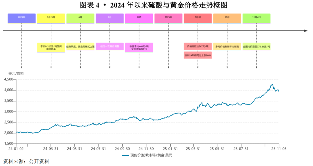 阴极铜生产环节中会副产出硫酸,一般情况下每产1吨阴极铜副产3~4吨硫酸,同时烟气制酸时余热回收所产蒸汽亦有助于降低综合成本。硫酸价格弹性主要取决于周边下游产业配套(化肥、钛白粉、新能源电池等),汽运的运输半径一般在300公里以内经济性最佳。2024年以来,硫酸价格经多次调整后整体处于高位,明显提升了铜冶炼厂的盈利水平,以江西铜业、铜陵有色与云南铜业为例,其2024年硫酸产品销售毛利率分别达34%、49%和40%;目前硫酸价格受益于硫磺价格支撑仍处相对高位,但未来硫酸利润是否能稳定弥补TC亏损有待进一步观察。同时,冶炼企业生产受硫酸产品安全库存周转制约,若未来出现硫酸库存积压,将会带来价格暴跌以及仓储运输成本增加等风险。