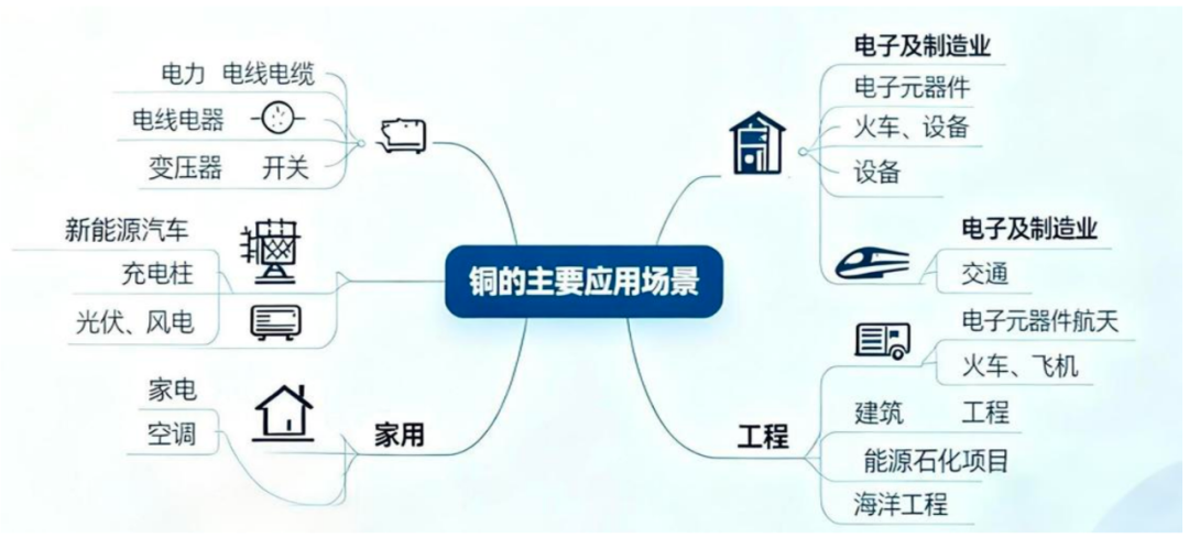 铜是人类历史上最早被认识和使用的金属之一,因其优异的导电、导热、延展与耐腐蚀性能,铜在现代社会中的应用极其广泛。作为一种重要的基础工业原料,铜对人类社会的发展起到了至关重要的作用,其产业链可简单划分为上游矿山开采、中游铜矿冶炼以及下游铜材加工,最终进入终端消费市场。